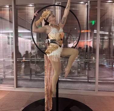 Our talented performers will dazzle your guests with their incredible skills and mesmerizing acts. Let us bring the excitement of fire and aerial dancing to your event, creating unforgettable memories in black and gold color themes.